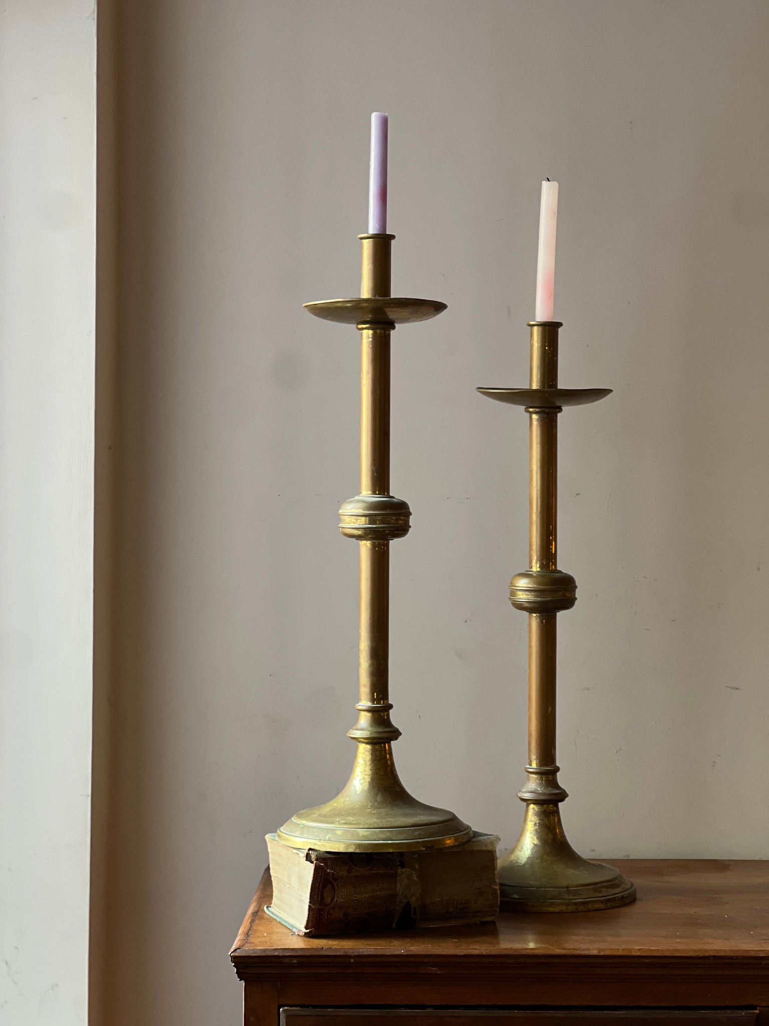 Beautiful pair of altar candlesticks in brass of an impressive scale.. Perfect decoration for those autumnal months